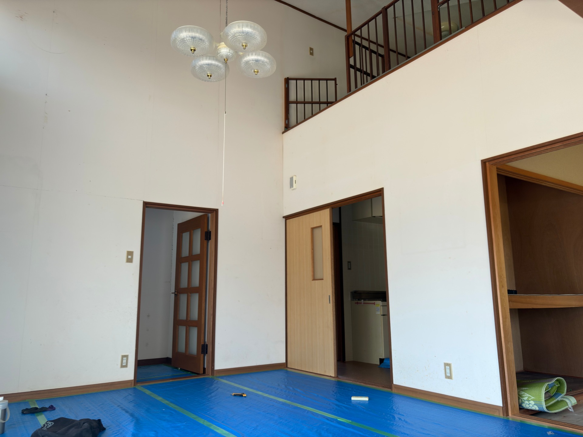 今回の現場では玄関の天井の壁紙を張り替えていますが、吹き抜けの天井のため、足場を設置しております。